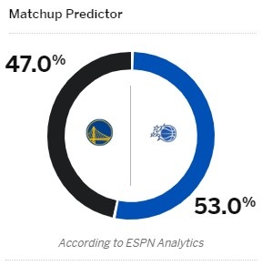 Today, ESPN released its winning rate prediction for this game, with the Warriors at 47% and the Magic at 53%.