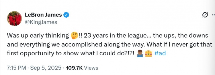 James recommended at 19:15: "Wake up early in the morning and have a lot of thoughts!! In the 23 years of the league, I have experienced ups and downs and achieved countless achievements. What would have happened if I didn't have the opportunity to show myself? 🤷🏰♂️👑? (Advertising)"