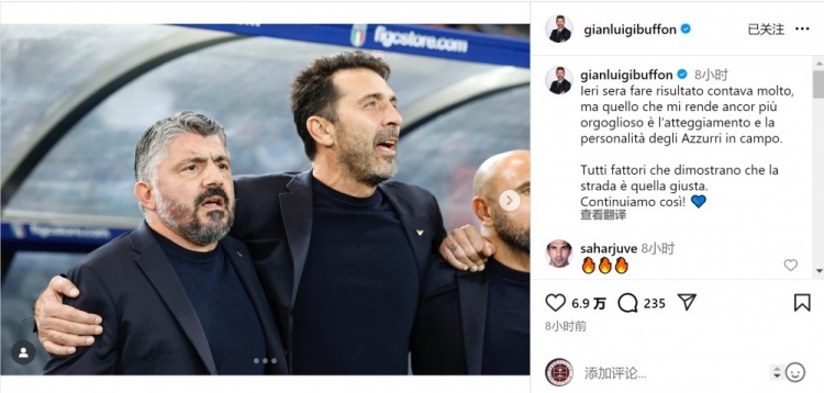 The Italian national team leader Buffon posted a photo with coach Gattuso on social media and wrote: "The result of last night's game is very important, but what makes me even more proud is the attitude and personality displayed by the Azzurri on the field."