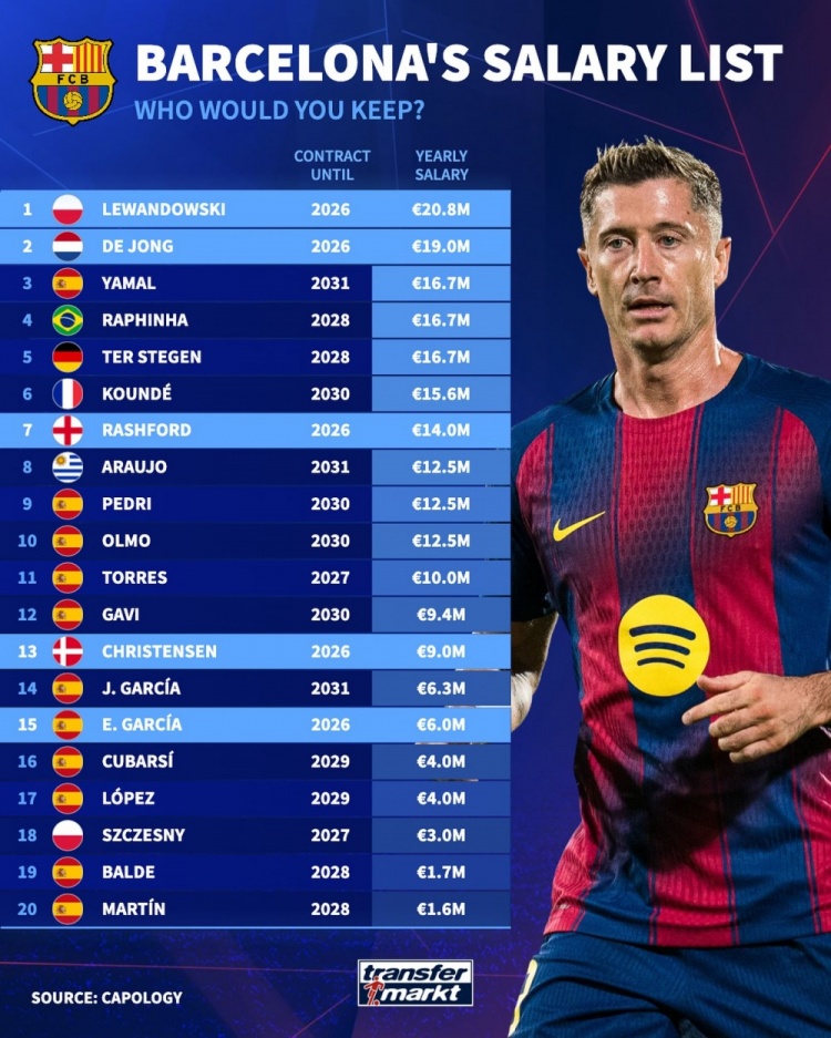 Olmo (2030) – - 12.5 million euros Ferran Torres (2027) - 10 million euros Garvey (2030) - 9.4 million euros Christensen (2026) - 9 million euros Joan Garcia (2031) - 6.3 million euros Eric Garcia (2026) ) - 6 million euros
