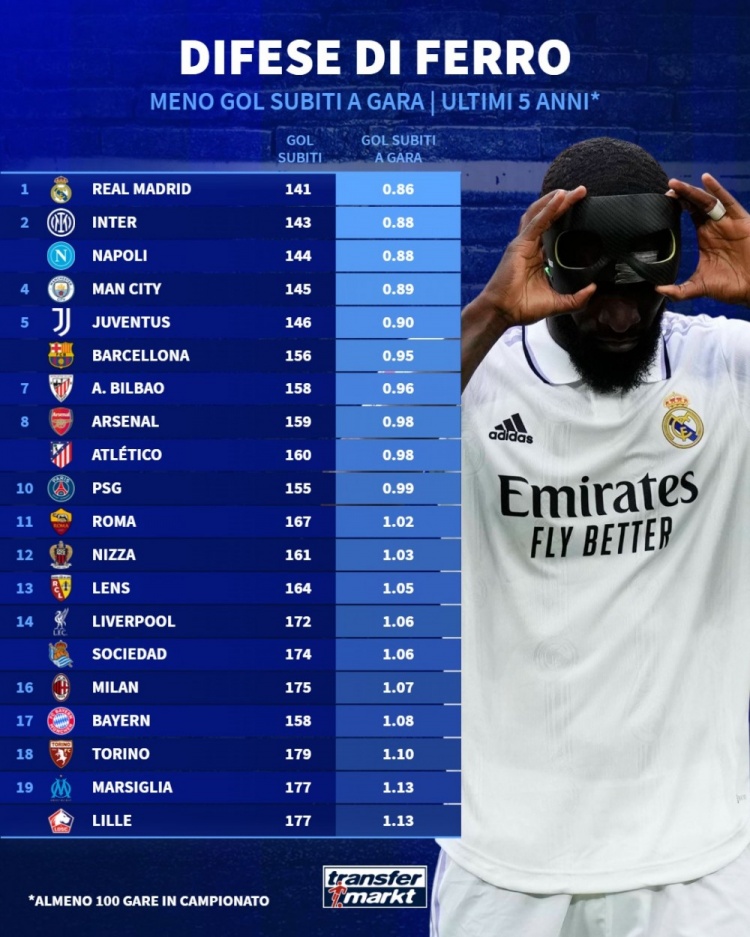 The German transfer market has counted the average goals conceded by teams in the five major leagues since the 2020-2021 season, and listed the list of the fewest goals conceded per game. Real Madrid ranked first with 0.86 goals, followed by Inter Milan and Naples.