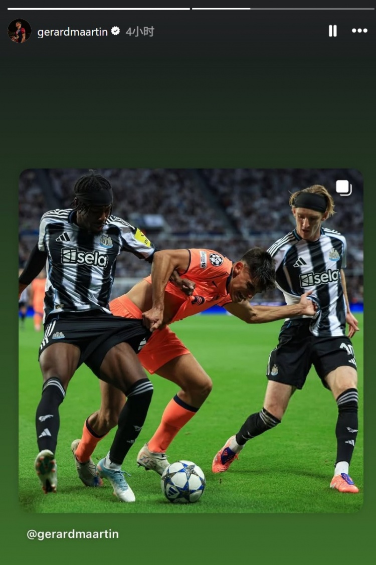 Barcelona player Martin started in this game, and he also posted photos of him confronting two Newcastle strikers, Gordon and Ilanga, on his personal social media.
