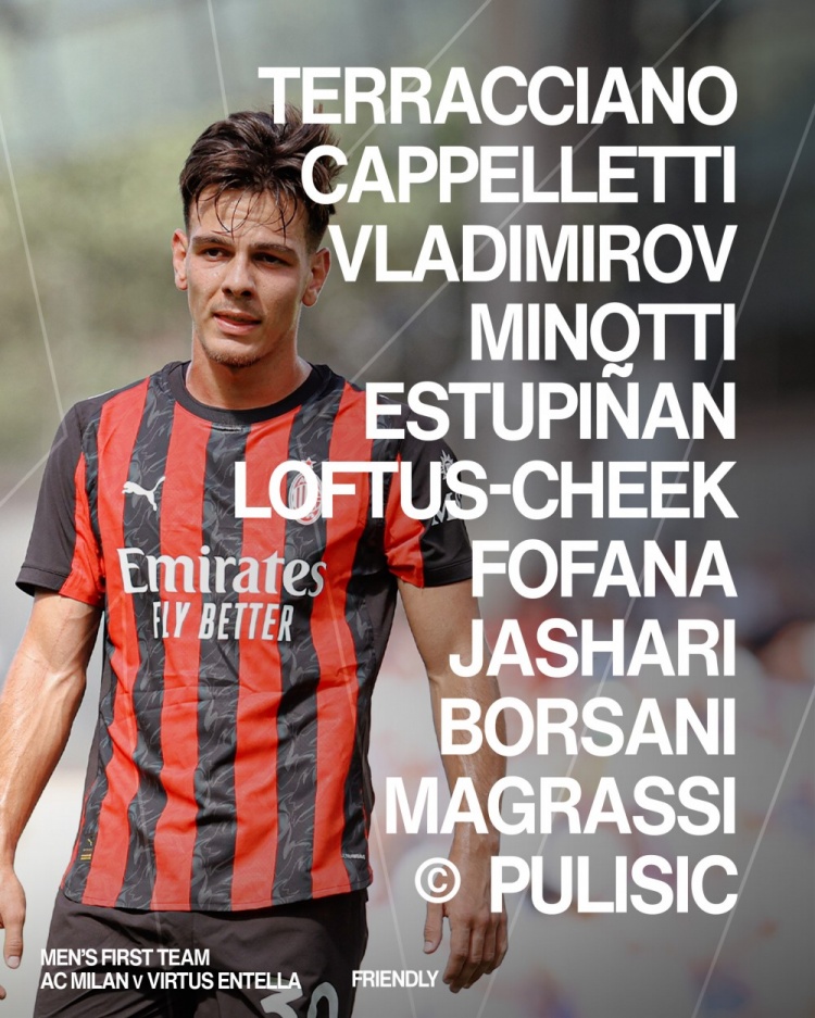 AC Milan starting lineup: Terraciano; Cappelletti, Minotti, Vladimirov; Estupinian, Fofana, Asari, Cheek, Bolsani; Magrassi, Pulisic