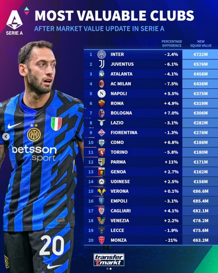 Serie A team German turnover price ranking: Inter Milan ranked first with 722 million euros, Juventus and Atlanta ranked second and third