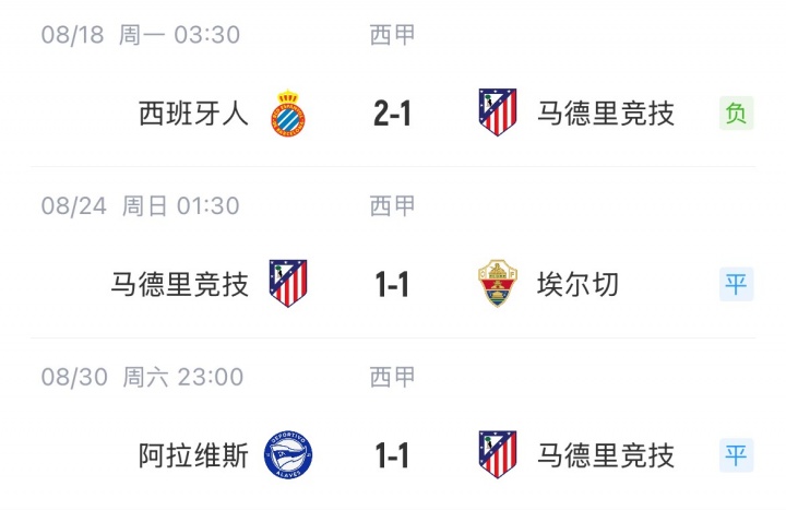 Atletico Madrid was reversed 1-2 by Espanyol in the first round and drew 1-1 with Elche in the second game. It is worth mentioning that Atletico Madrid scored first in three games.