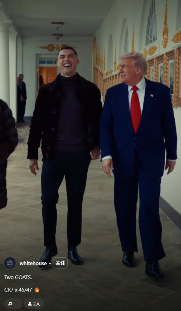 The White House official has just posted on social media, showing a clip of Cristiano Ronaldo and US President Trump walking in the corridor together, with the text: "Two GOATS, CR7 x 45/47š„".
